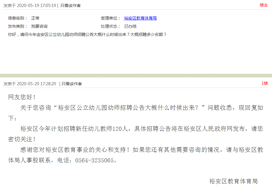 關于您咨詢“裕安區(qū)公立幼兒園幼師招聘公告大概什么時候出來?”問題收悉,現(xiàn)回復如下: