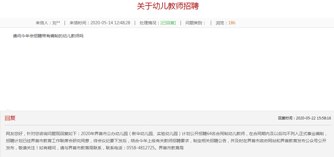 網(wǎng)友您好,針對您咨詢問題現(xiàn)回復如下:2020年界首市公辦幼兒園(新華幼兒園、實驗幼兒園)計劃公開招聘64名合同制幼兒教師,在合同期內及以后均不列入正式事業(yè)編制,招聘計劃已經(jīng)界首市教育工作聯(lián)席會研究同意,待會議紀要下發(fā)后,結合今年上級有關教師招聘要求,制定相關招聘公告,并及時在界首市政府網(wǎng)站和界首教育發(fā)布公眾號公開發(fā)布,敬請關注!如有疑問,請與界首市教育局聯(lián)系,聯(lián)系電話:0558-4812725。界首市教育局