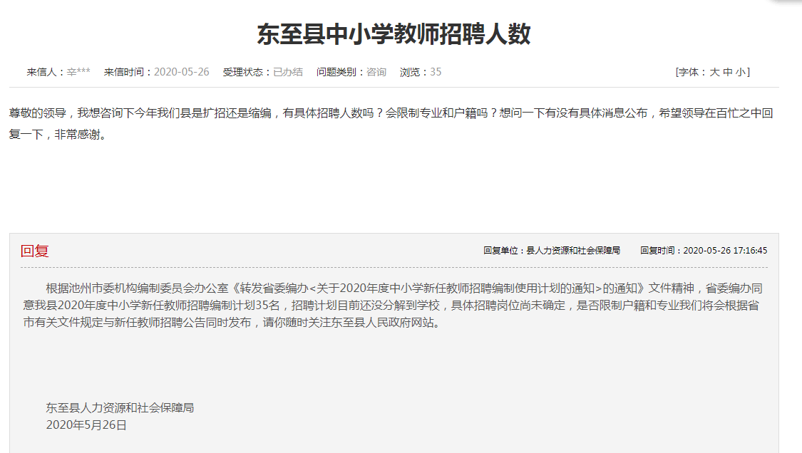 縣人力資源和社會保障局回復(fù)根據(jù)池州市委機構(gòu)編制委員會辦公室《轉(zhuǎn)發(fā)省委編辦<關(guān)于2020年度中小學新任教師招聘編制使用計劃的通知>的通知》文件精神,省委編辦同意我縣2020年度中小學新任教師招聘編制計劃35名,招聘計劃目前還沒分解到學校,具體招聘崗位尚未確定,是否限制戶籍和專業(yè)我們將會根據(jù)省市有關(guān)文件規(guī)定與新任教師招聘公告同時發(fā)布,請你隨時關(guān)注東至縣人民政府網(wǎng)站。