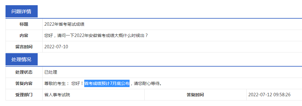 2022安徽省考筆試于7月9日-10日結(jié)束,相信很多小伙伴都比較關(guān)心公布成績的消息,以下是安徽博學(xué)教育小編在安徽省人社廳的互動(dòng)交流欄目看到的官方信息回復(fù),希望對(duì)有事幫助!
