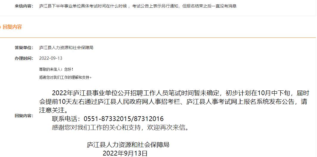 來信內(nèi)容:8月份出的廬江事業(yè)單位考試想知道什么時(shí)候出考試時(shí)間,麻煩回復(fù)一下,謝謝