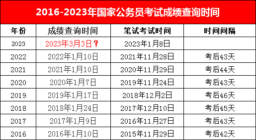 具體會(huì)在3月的哪一天呢?官方?jīng)]有公布,大家不妨先來(lái)看看往年筆試與成績(jī)發(fā)布之間的間隔,具體如下: