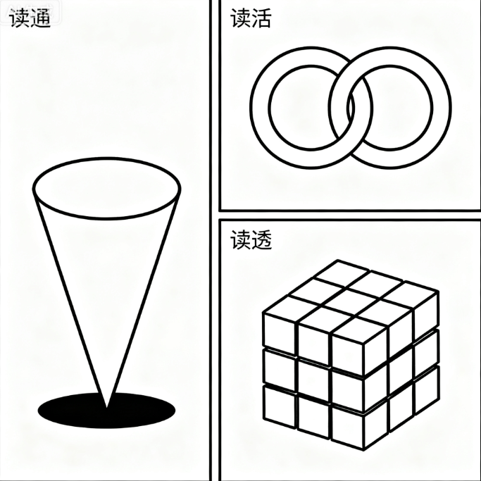 第四題、漫畫題,三個(gè)圖片,一個(gè)圖片是倒著的圓錐,一個(gè)是兩個(gè)扣住的圓圈,一個(gè)是一堆小正方體組成了一個(gè)大正方體,三個(gè)圖片代表著對讀書的不同方式,談?wù)勀銓ψx書讀通,讀活、讀透的看法。