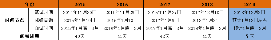 2019國(guó)家公務(wù)員考試筆試已于12月2日結(jié)束,那么,2019國(guó)考成績(jī)什么時(shí)候出呢?按照以往國(guó)考成績(jī)查詢時(shí)間預(yù)測(cè)2019國(guó)考成績(jī)查詢時(shí)間將在2019年1月中下旬左右,在此,小編附上歷年國(guó)家公務(wù)員考試成績(jī)查詢時(shí)間,希望能幫助各位考生做好面試備考的準(zhǔn)備。