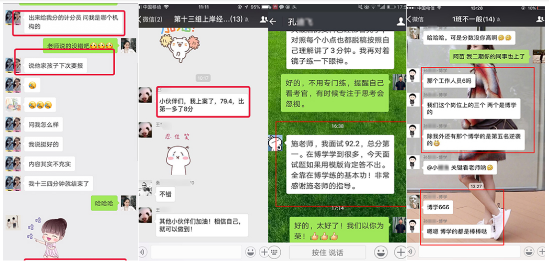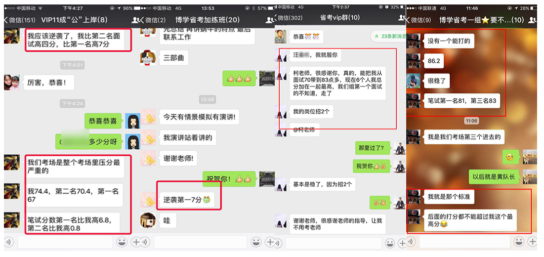 在2010年—2018年國考中,很多人僅僅是因為看了網上博學教育公務員班的幾段視頻,就毫不猶豫地選擇博學教育,最終成功地實現了他們的公務員之夢。2010年安徽省考高陽同學面試取得88.4的高分,一舉從筆試第23名躍居為綜合排名第一名,成為巢湖市面試狀元;胡卓然同學以86分的成績勇奪南京市第一名,被南京市國土資源局錄取。廣東的鄭滋潤同學,數次公考面試失敗,2011年慕名來到博學施老師門下,經過七天學習,脫胎換骨,以91分的成績遙遙領先對手被財政部駐深圳市專員辦錄??!2011年安徽省考季毓同學面試取得88的高分,成為馬鞍市面試狀元;2012年上海的潘安安同學,以88.3的高分被上海海關隸屬海關通關業(yè)務部門錄取。2013年福建的王子熙同學,以89.4的高分被廈門海關廈門地區(qū)隸屬海關或辦事處錄取。2013年安徽省考牛園園同學取得面試86.8分,成為亳州市面試狀元!2014年安徽的曹珍同學,以86.8的成績勇奪安徽省直面試狀元,被安徽省女子監(jiān)獄錄取。2015年國考安徽的曹燦同學,以92.25分的成績被中國銀行業(yè)監(jiān)督管理委員會安徽監(jiān)管局錄??!2015年安徽省考陳雯同學以面試87.2的高分勇奪蕪湖市面試狀元;趙錦同學以面試86.4的高分取得天長市面試狀元;查菁文同學以面試86的高分取得定遠縣面試狀元。2016年國考面試,張雨豪以91分的成績被甘肅省國家稅務局錄取。2016年安徽省考陳蓉同學以面試86.8分取得馬鞍山市非鄉(xiāng)鎮(zhèn)公務員面試狀元;2017年國考,劉大偉勇奪山東省面試狀元,以98.67分被商務部錄取;阮帆同學面試取得91.33分,上海市國稅錄?。秽嵪胪瑢W面試取得90.3分,上海國稅錄;2017年安徽省考顧博賢同學以面試88分取得利辛縣非鄉(xiāng)鎮(zhèn)公務員面試狀元。2018年國考徐起以87.33分被中央國家機關工委錄取,夏鈺以88.33分被中國浦東干部學院錄取。2018年安徽省考,周陽以83.8分取得銅陵市鄉(xiāng)鎮(zhèn)層級面試狀元;魏宇以82.8分取得亳州市鄉(xiāng)鎮(zhèn)層級面試狀元!
