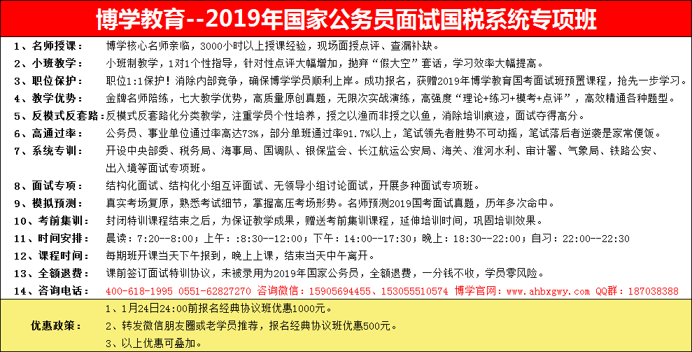 詳見協(xié)議(包括培訓(xùn)費(fèi)、教材費(fèi)、住宿費(fèi)、餐費(fèi)、水果點(diǎn)心費(fèi)等一切費(fèi)用)。學(xué)員無論任何情況未被錄用為2019年國家公務(wù)員,我校將退還全部費(fèi)用。